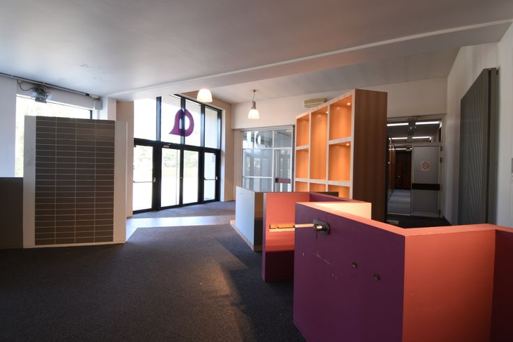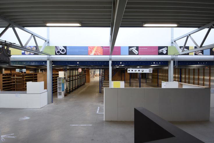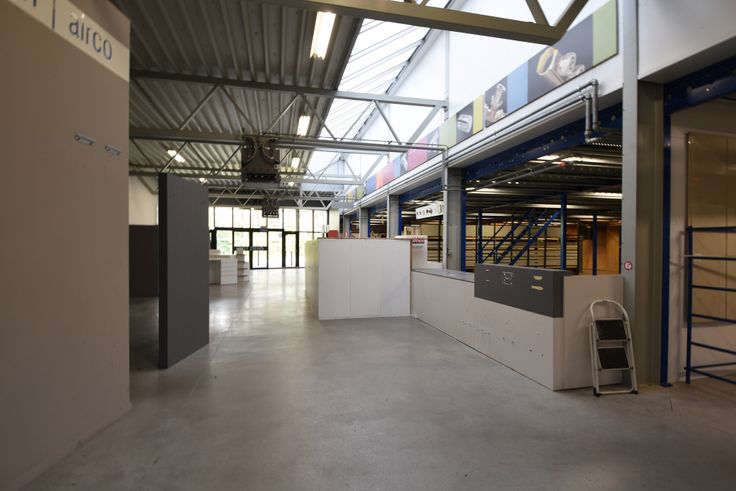 Via de inkomdeur aan de voorkant heeft u toegang links tot de kantoren met achtergelegen magazijn van ca 1600m² met een hoogte van 7.5m en rechts tot de showroom met extra achtergelegen magazijn van ca 1000m² met een hoogte van 6.4m.
