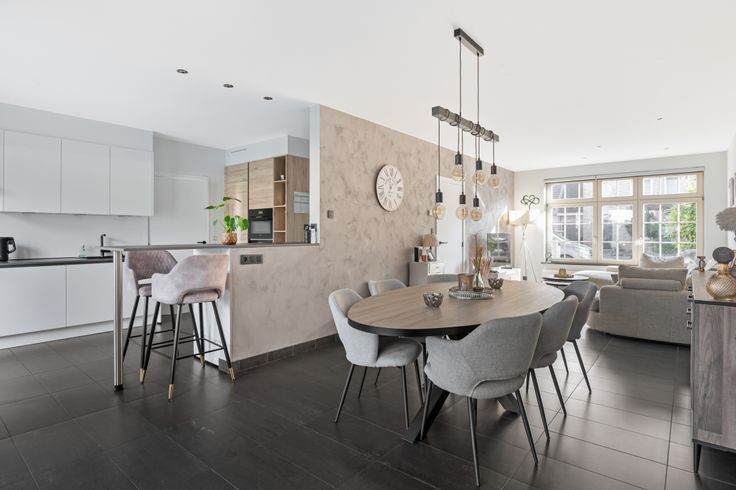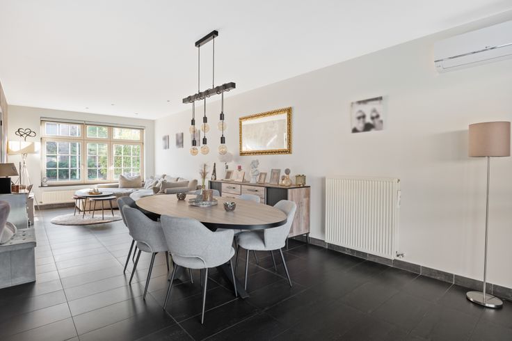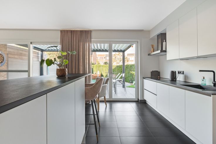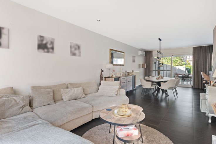 Vervolgens hebben we een gezellige living met airco en open keuken die uitkijkt op tuin .