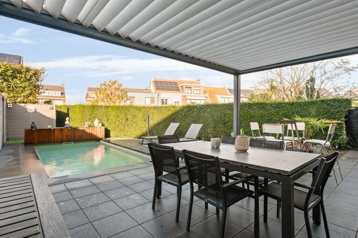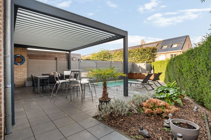 Tevens is er een pergola (merk Brustor) met kantelbaar lamellendak ,ingebouwde ledverlichting,screendoeken en extra verwarming voorzien