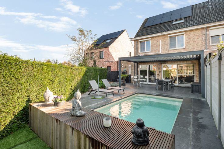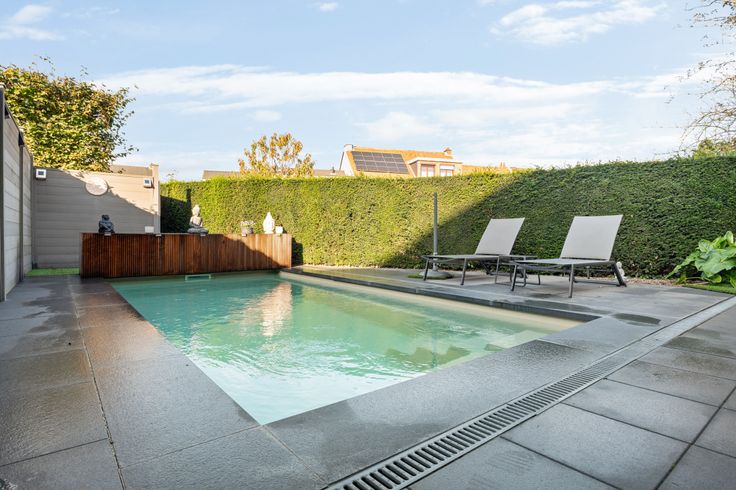 Dan hebben we nog een zuid west gerichte tuin met ingebouwd verwarmd zwembad met volledig automatische chloorregeling (4 j oud)