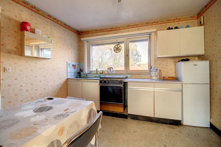 Au 1er étage : Hall desservant un séjour de +/- 30m² (salon et salle à manger), une cuisine semi-équipée (plaque de cuisson, four, évier, coin repas et rangements), 3 chambres à coucher de 12m², 10m² et 8m², une salle de bains composée d’une baignoire/douche, d’un lavabo, un WC séparé.