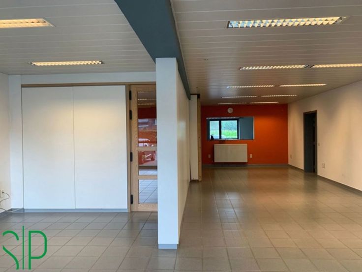 Het pand heeft de volgende indeling: Grote ruimte die momenteel is onderverdeeld (dmv wegneembare wanden) in een receptie, bureel en werkruimte (96m²). Achteraan is een berging voorzien (tegels; 5m²), 2 toiletten en een ingerichte keuken (tegels; kasten, dampkap, keramisch kookvuur, dubbele spoelbak, vaatwasser en koelkast; 15m²).