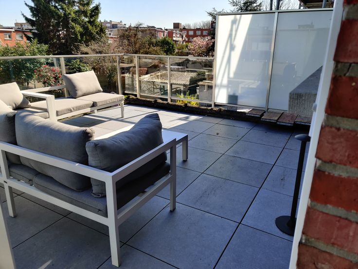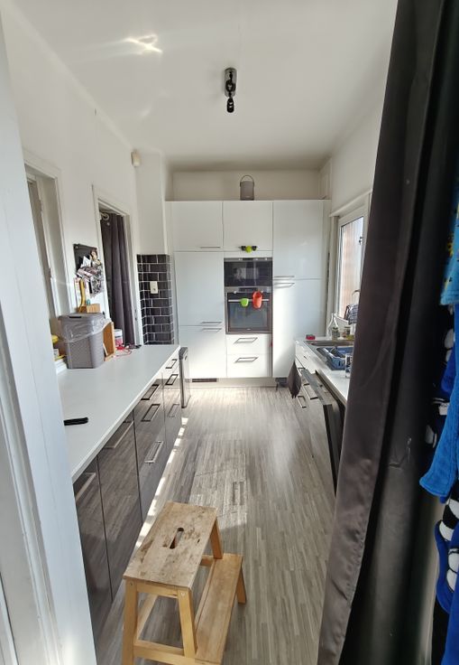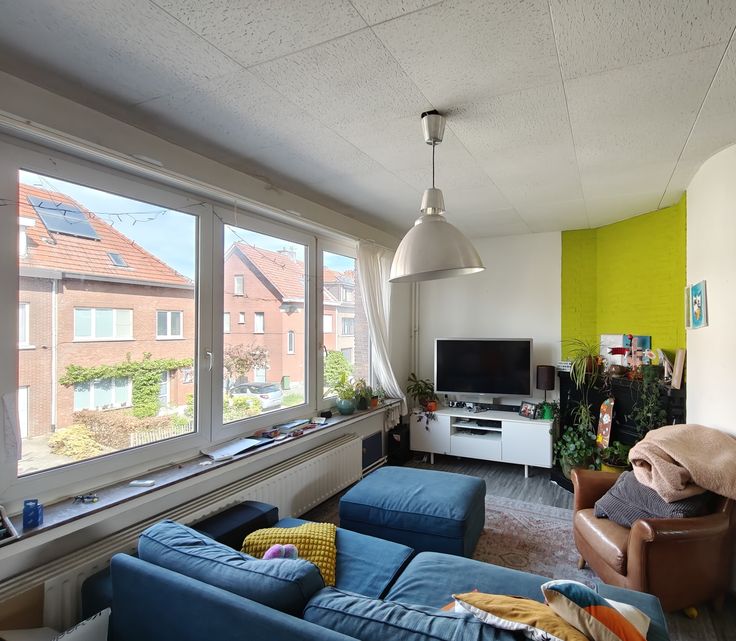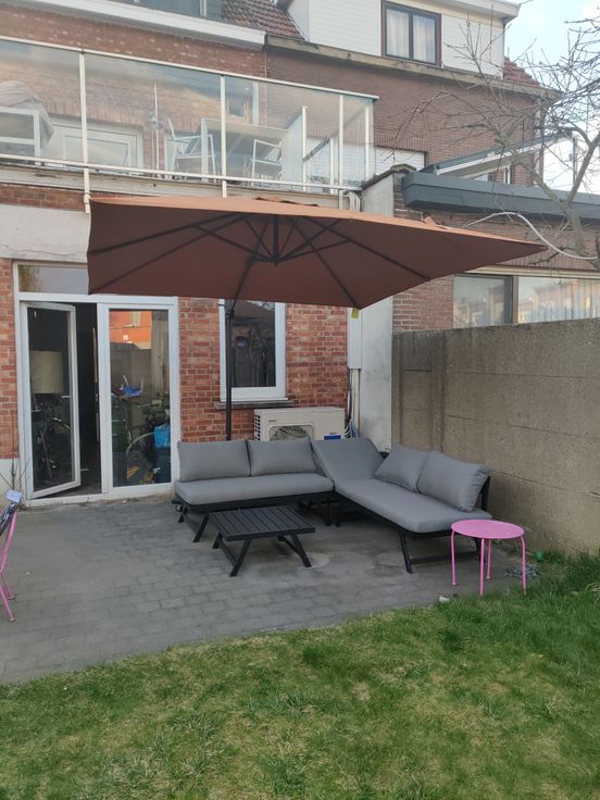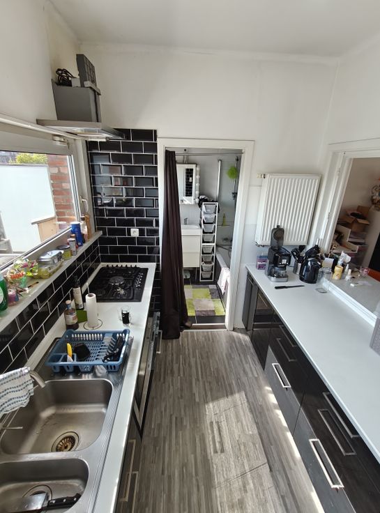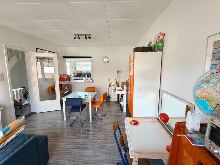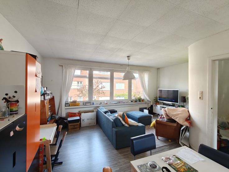 Erg lichte woonkamer, keuken, badkamer en prachtig groot terras, zuidoostelijk georiënteerd.