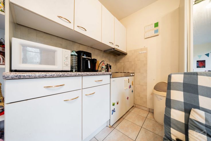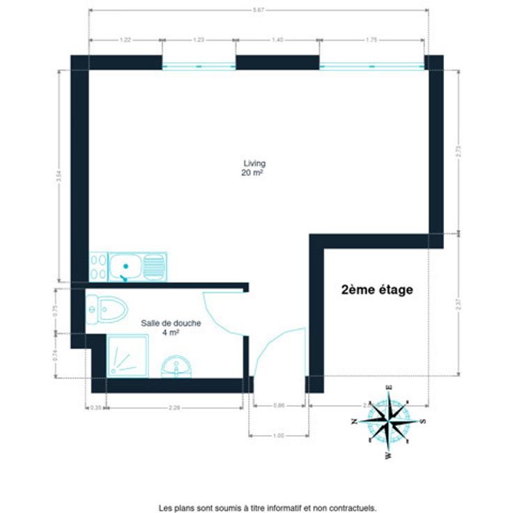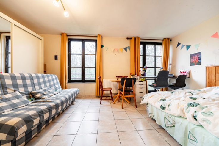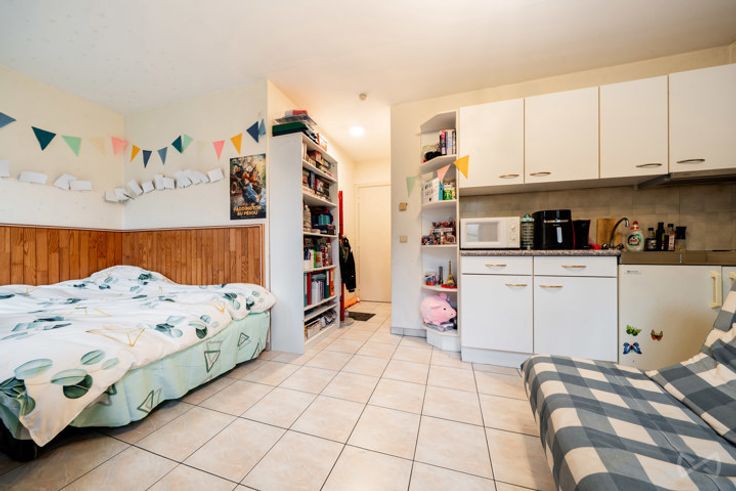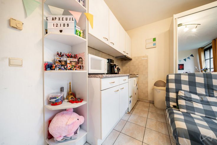 De studio bevindt zich op de 2e verdieping en biedt 24 m² woonruimte. Het bestaat uit een woonkamer van 20 m² met keukenhoek en een doucheruimte met toilet en wastafel. Er is ook een kelder van 4 m² beschikbaar (ideaal voor 2 fietsen).