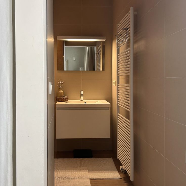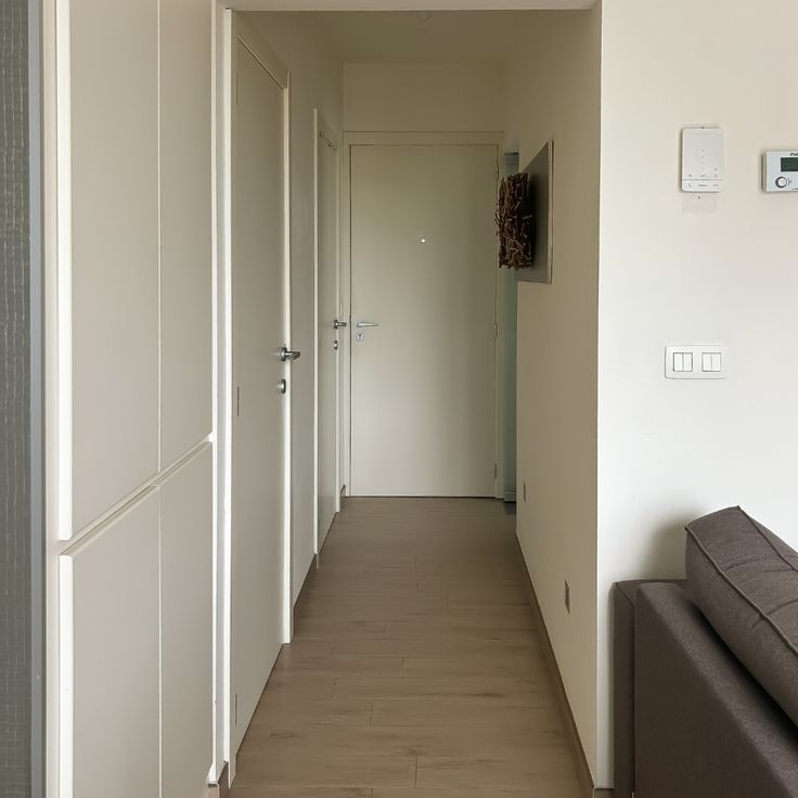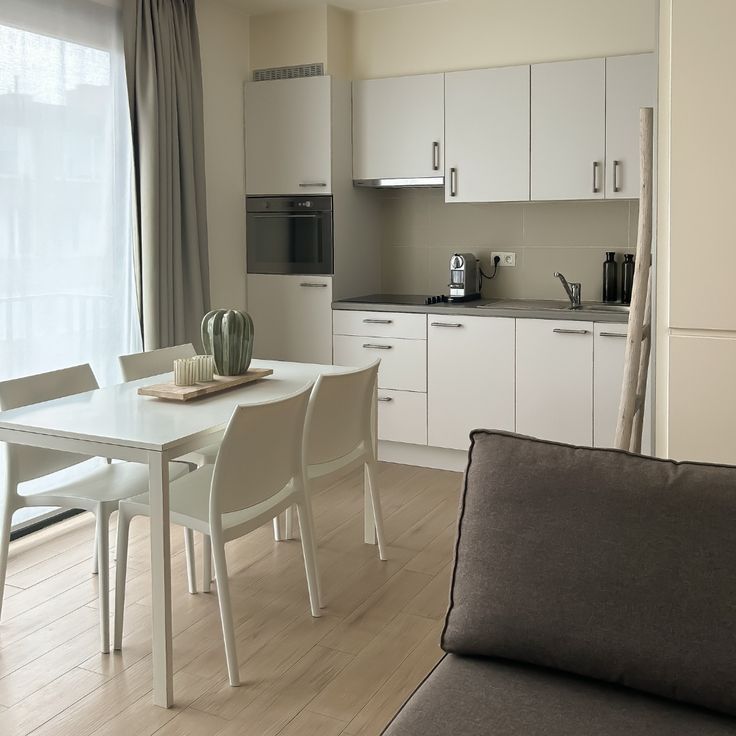 De gezellige leefruimte en open keuken vormen één harmonieus geheel, afgewerkt met parkettegels over het hele appartement. De keuken is uitgerust met combi-oven, koelkast en slimme kastindeling. Het tv-meubel beschikt over ingebouwde LED-sfeerverlichting. In de hal zorgt discrete ingebouwde nacht-LED-verlichting voor extra comfort.