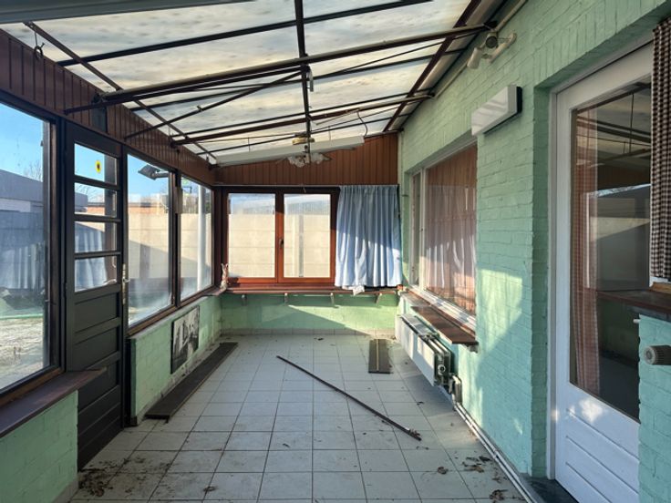 Op het gelijkvloers bevindt zich de inkomhal die leidt naar een ruime, lichtrijke woonkamer met eetplaats. Daarnaast is er een op te knappen keuken, een technische berging en een veranda die uitkijkt op de tuin. De indeling biedt veel potentieel om een open en moderne leefruimte te creëren.