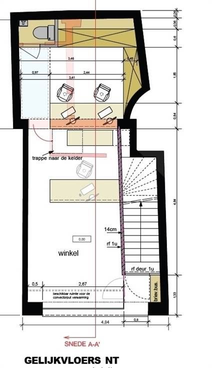 - Gelijkvloers: winkel met wc en aansluitingen sanitair.