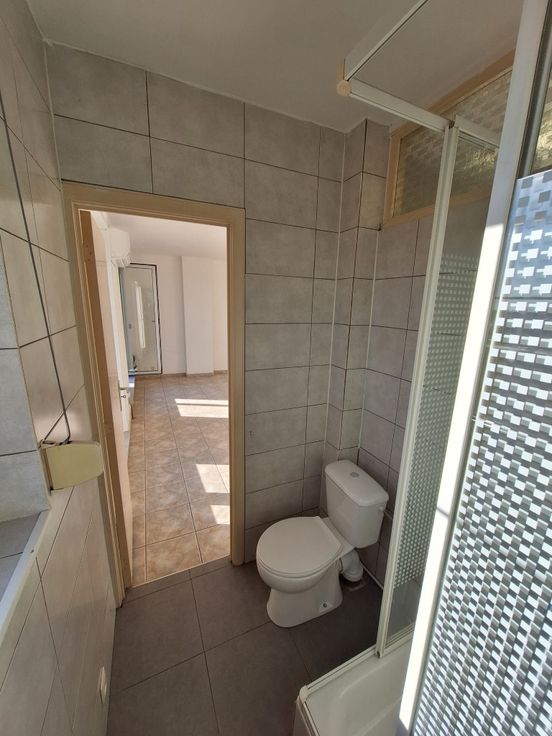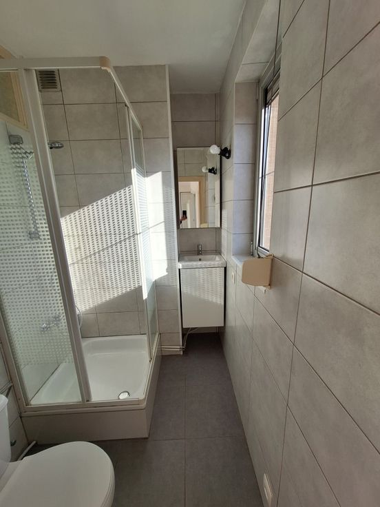 Tegelvloer, wanden betegeld, plafond geverfd. Douche, toilet (nieuw), lavabo met aanbouwmeubel (nieuw), spiegelkast (nieuw), ventilatierooster, vliegenraam, handmatig rolluik.