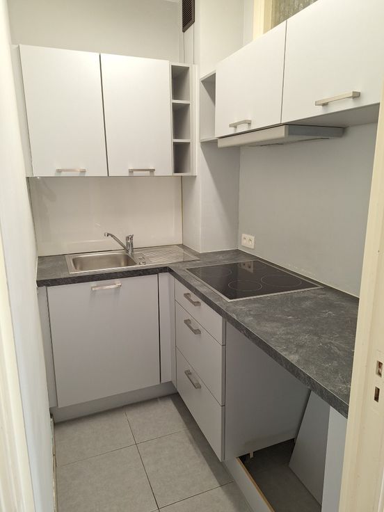 Tegelvloer, wanden en plafond geverfd. Keramische kookplaat met dampkap, enkele lavabo, elektrische doorstromer, ventilatierooster, grijze aanbouwkasten.