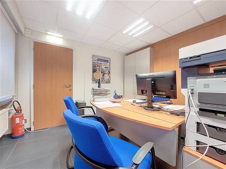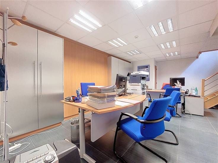 Le rez-de-chaussée se compose d’un espace d’accueil ou salle d’attente, d’un bureau fermé et d’un petit open space. À l’étage, vous trouverez une salle de réunion (ou un second bureau), une cuisine partiellement équipée, un petit débarras et un WC séparé.