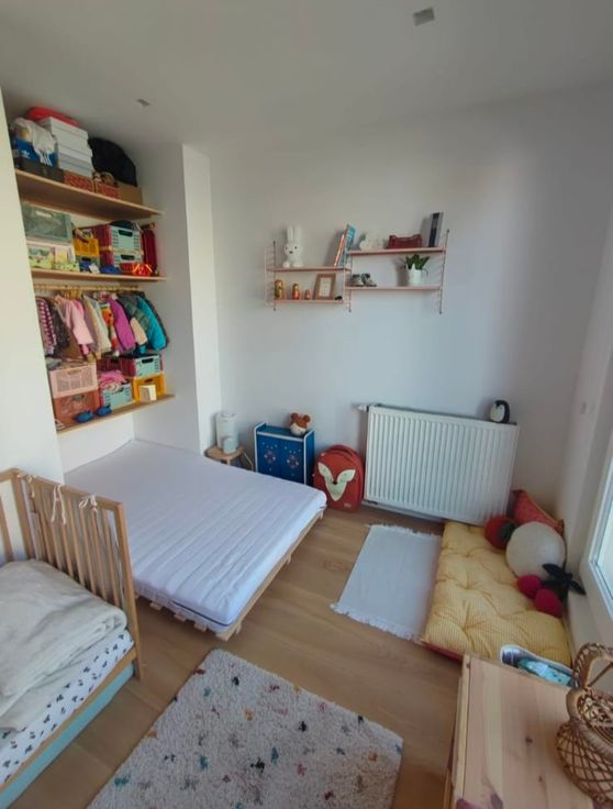 Se compose comme suit : Au Rez de chaussée : living sur toute la surface et wc invité, au rez de jardin : cuisine ouverte sur salle à manger et jardin de 45m2 orienté Est, Au 1er : 2 belles chambres (11m2) dont une avec dressing encastré, une salle de bain avec emplacement Machine à laver et séchoir, wc séparé, Au 3e : 1 grande suite parentale (25m2) avec salle de douche attenante.