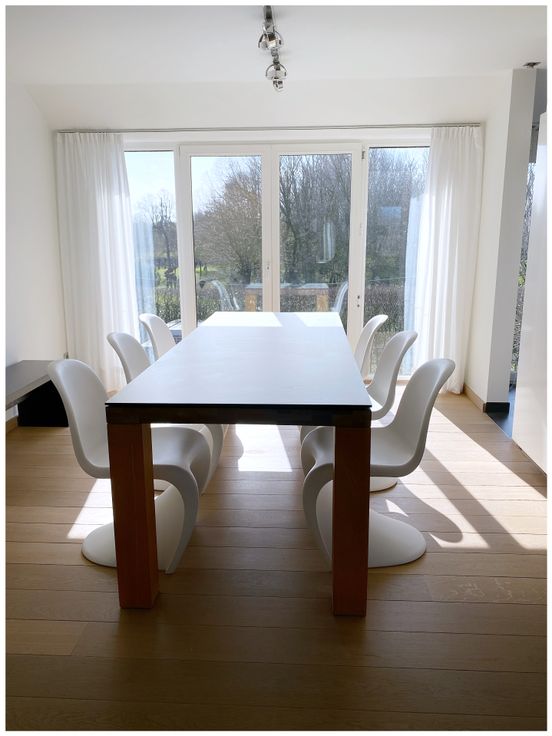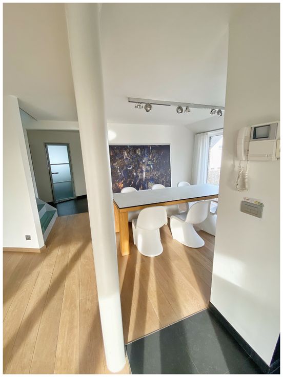 Stijlvol modern ruim duplex appartement. Gelegen aan de rand van Hasselt, met mooi uitzicht op natuurgebied. Gemeubeld appartement in tweewoonst. Zithoek en eethoek met massief parket, ingerichte leefkeuken met koelkast met vriesvak, inductievuur, oven, microgolfoven, vaatwasmachine, Nespresso koffiezet. Lederen hoeksalon en lounger. Bureau, toilet, badkamer met regendouche, master bedroom met waterbed en tv/dvd, kinderkamer, bureauruimte, berging, wasplaats met wasmachine+droogkast. Zuid-georiënteerd terras met terrasmeubilair. Domotica. Suround geluidsinstallatie en beamer. DAB Radio met bluetooth. Designmeubilair (Le Corbusier, Panton, Starck, Noguchi). Starlink satelliet breedband internet verbinding.