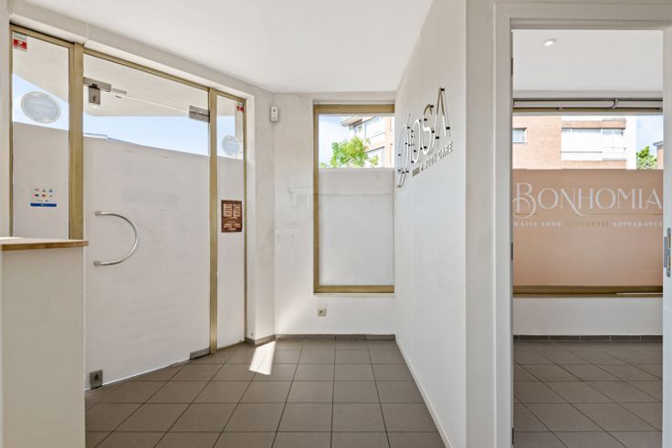 Dankzij de hoeklocatie geniet je van maximale visibiliteit en natuurlijke lichtinval langs twee straatzijden. De grote raampartijen en uitnodigende gevel zorgen voor een warm welkom voor klanten of passanten.