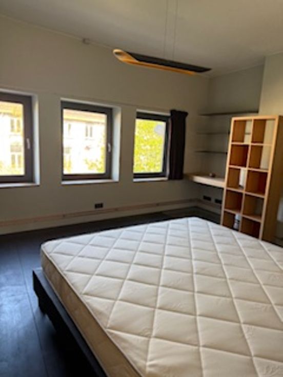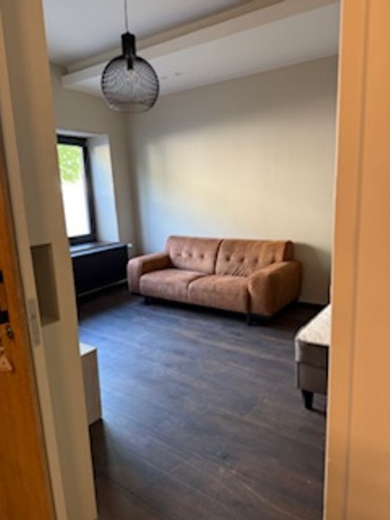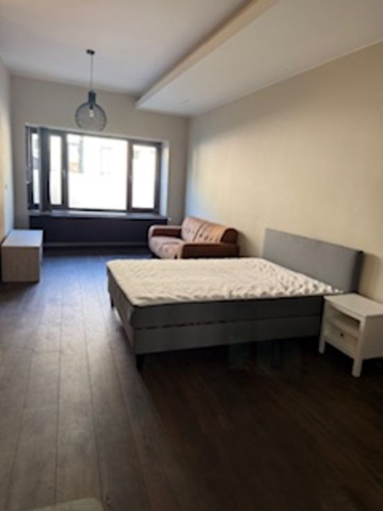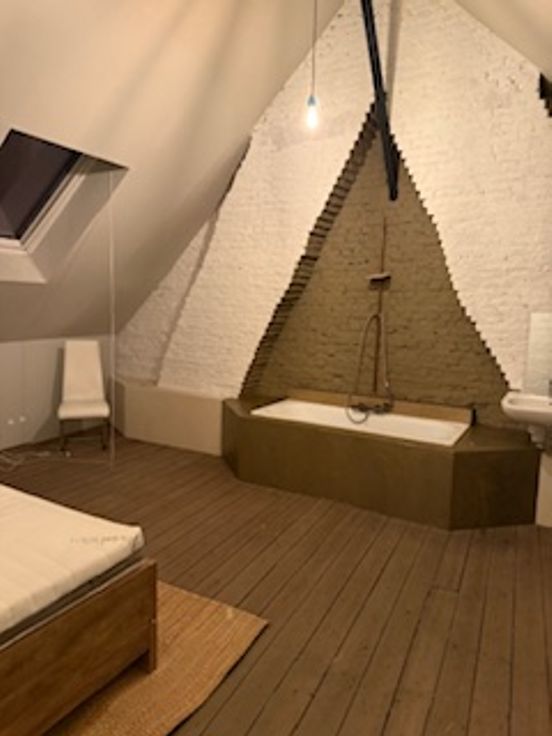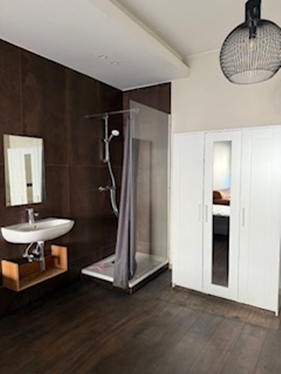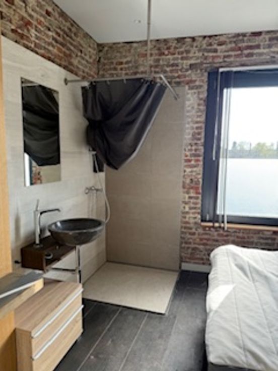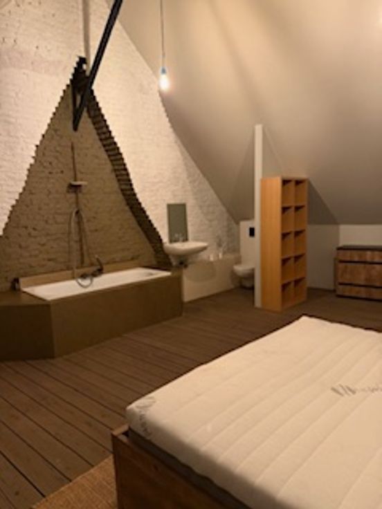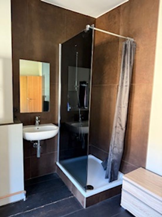 Bij binnenkomst valt direct de veelzijdigheid van deze woning op. De gelijkvloerse verdieping herbergt een ruime kamer met eigen douche en lavabo en een gemeenschappelijke volledig uitgeruste nieuwe keuken (vaatwasser, koelkast, diepvriezer, kookvuur en ook extra ijskast met vriezer) en toilet. Er zijn 2 toegangsdeuren tot het gebouw en er is plaats voor de fietsen. Op de tussen verdieping is er een ruime design badkamer met ligbad, inloopdouche, toilet en lavabo.