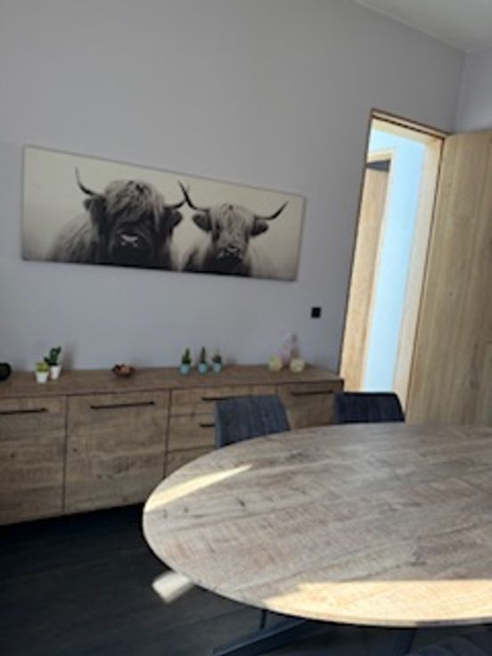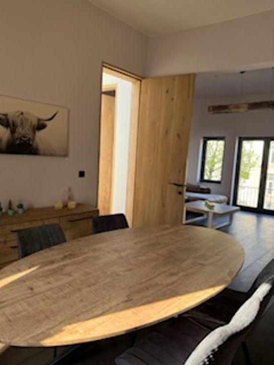 Op eerste verdieping is er een ruime woonkamer met veel raampartijen er is een zithoek en een eetplaats. Er is ook een TV aanwezig. Op de volgende verdieping zijn 2 kamers opnieuw elk met eigen douche en toilet. De zolderverdieping is een pareltje met eigen ligbad, toilet en lavabo – heel ruim met plankenvloer.