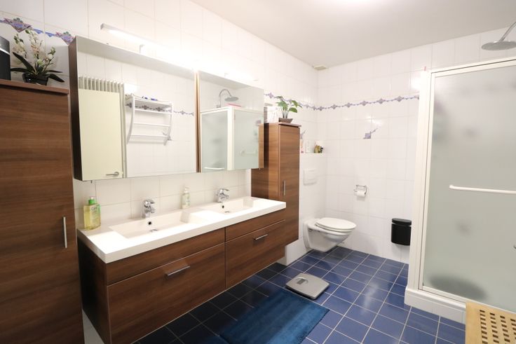 - badkamer met douche, dubbele wastafel en tweede toilet;