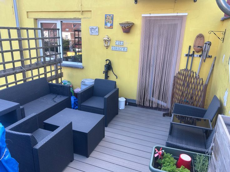 Etage 1: large séjour avec cuisine equipée semi-ouverte et terrasse rénovée (sol en composite).