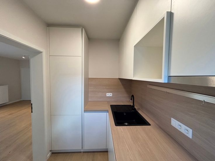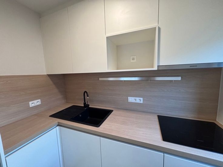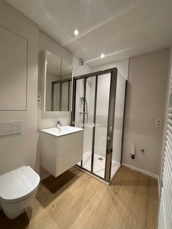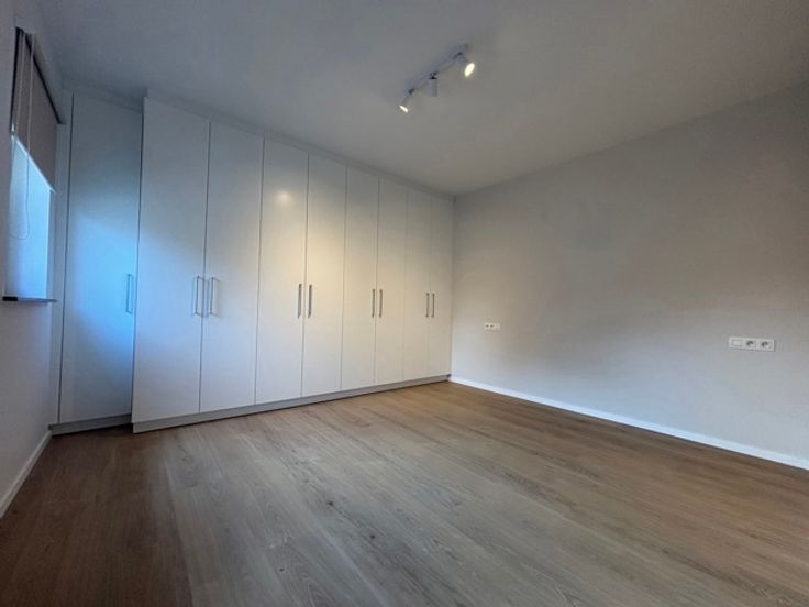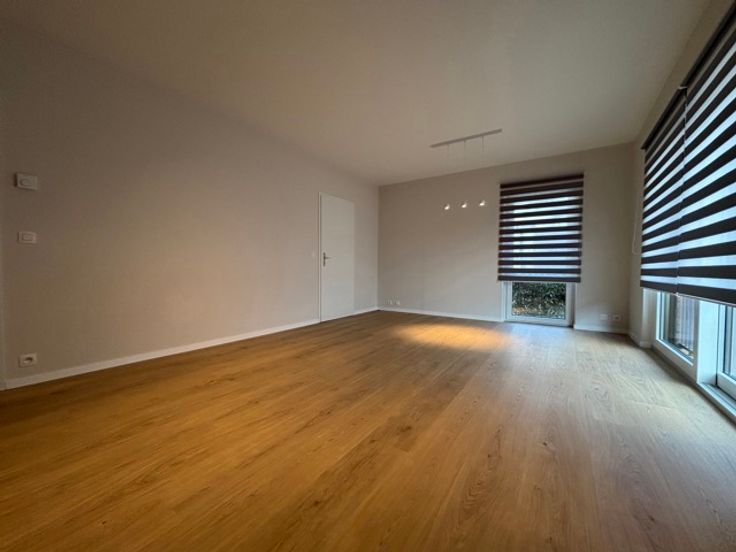 Composition: hall d'entrée (meuble sur mesure), salle de douche neuve, grand séjour (stores déjà placés), cuisine équipée neuve, grande chambre à coucher (meuble sur mesure + stores déjà placés).