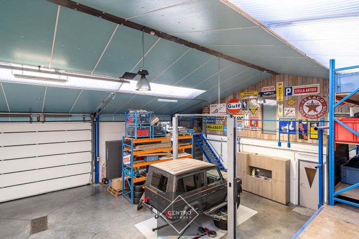 Benaderende OPPERVLAKTEN: Constructie - bewoonbare oppervlakten Woning: 293 m² Werkplaats: 260 m² + mezzanine 70 m² Grondoppervlakte Totale grondoppervlakte: 1.266 m² INDELING: Woning Gelijkvloers: Inkom met traphal - ruim toilet - lichtrijke woonkamer met pelletkachel - eetkamer - volledig geïnstalleerde keuken (met alle toestellen, waaronder inductiekookplaat, ingebouwde vaatwasser en koelkast, dampkap, oven, microgolf) - wasplaats - bijkeuken – slaapkamer (met maatkasten) - bureel/praktijkruimte - badkamer (inloopdouche, wastafel) - carport 2 wagens - hoge luifel (mobilhome/boot…) - zuid-oost gericht & volledig aangelegd terras (overdekt gedeelte, bijgebouw met bar). Eerste verdieping: Nachthal - badkamer (met ligbad, wastafel, spiegelkast) - 2 ruime slaapkamers - polyvalente ruimte (massagedouche, sauna) - 2 ruime zolderbergingen. Werkplaats: Verwarmd magazijn/opslagruimte/werkplaats, voorzien van bureelruimte, berging, kitchenette, toilet, mezzanine/tussenverdieping. SPECIFICATIES: Constructie: metaalconstructie Vuylsteke Wanden: silexbetonpanelen geïsoleerd (EPS+minerale wol). Bevloering: gepolierde en gewapende betonvloer in loods; natuursteen, keramische tegels, massieve eiken parketvloer en laminaat in het woongedeelte Dak: hellend dak met isolatie en 2 lichtstraten in de loods Deuren en poorten: elektrische sectionaalpoort Krial met afzonderlijke loopdeur (b: 5,00m – h: 3,70m); automatische poort aan de oprit Overspanning magazijn:... Renovatieplicht: nee