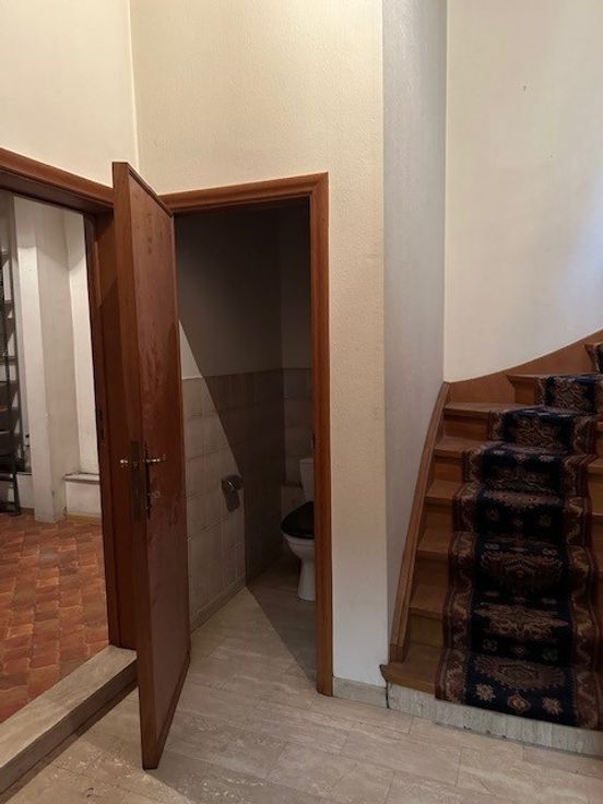 Op de gelijkvloerse verdieping met hoge plafonds, kom je via de voordeur toe in een grote inkomhal. Je vindt hier het gastentoilet en de trap naar boven met daaronder een handige bergplaats.