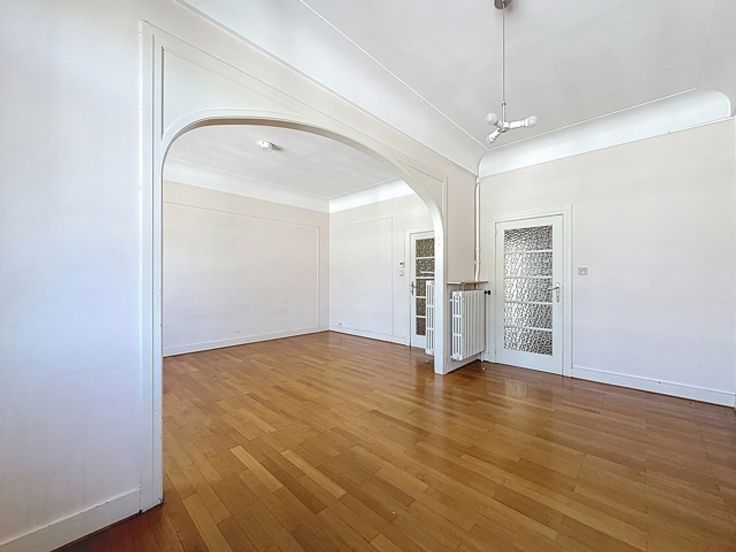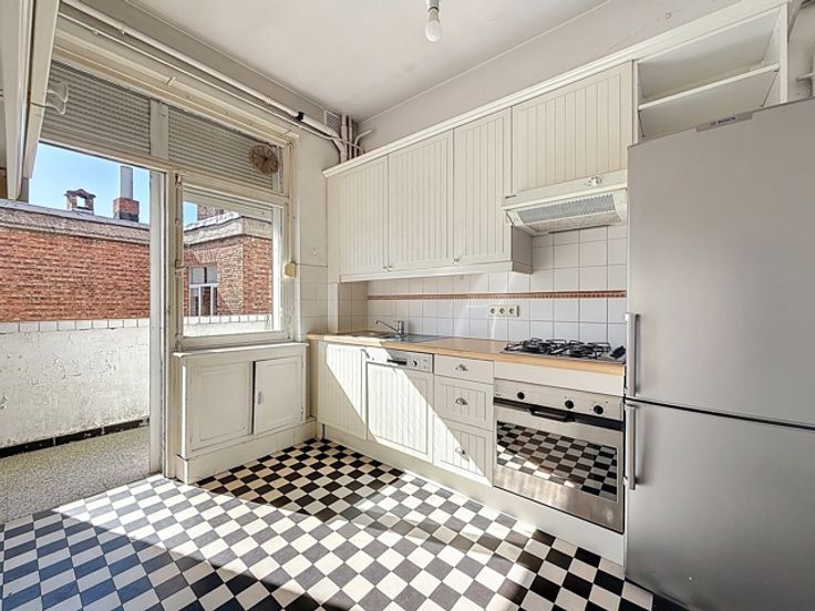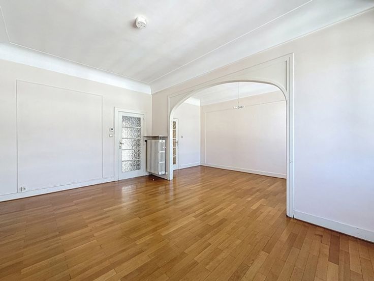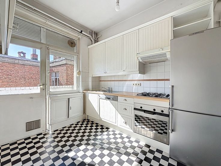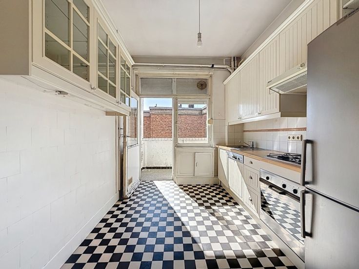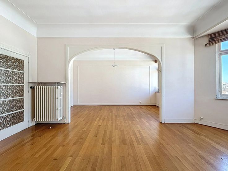 Ideaal gelegen in de onmiddellijke nabijheid van het Brugmannplein, mooi appartement met een totale oppervlakte van ± 100 m² bruto met een terras op het zuidoosten van ± 8 m² in een mooi gebouw. Het is als volgt samengesteld: inkomhal van ± 9 m², aparte watercloset van ± 1 m², woonkamer van ± 33 m², keuken van ± 10,5 m², nachthal van ± 3 m², 2 slaapkamers van ± 15,5 en 14 m², badkamer van ± 4,5 m². Ook: dubbele beglazing, dienstbodekamer, kelder, niet-conform elektrisch certificaat, individuele gasketel. EPB G. Onmiddellijk te bezichtigen!