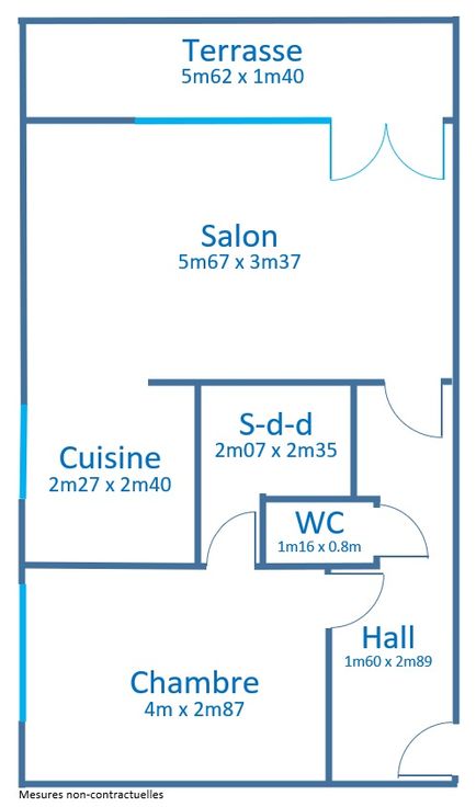 Appartement 1 chambre + hall d’entrée + Salon/Salle-à-manger + cuisine + sdd + wc séparé + terrasse.