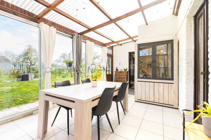 Au rez, la cuisine donne sur une véranda ouverte sur le jardin. La disposition est pratique et le cadre de vie est très agréable.