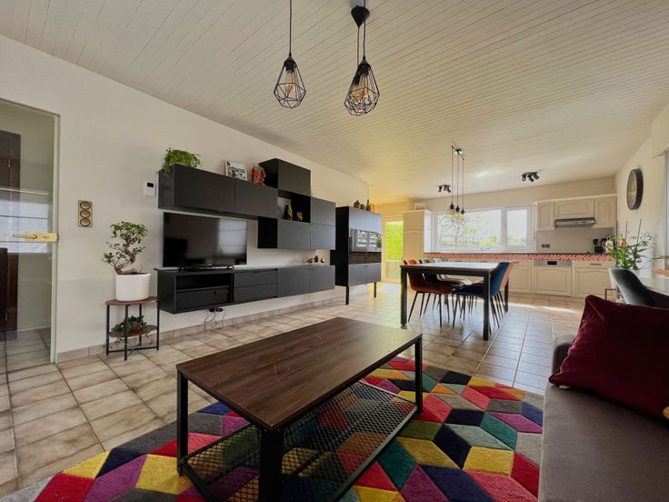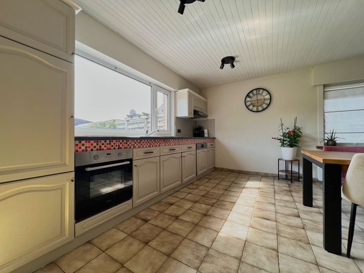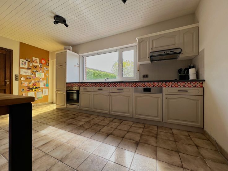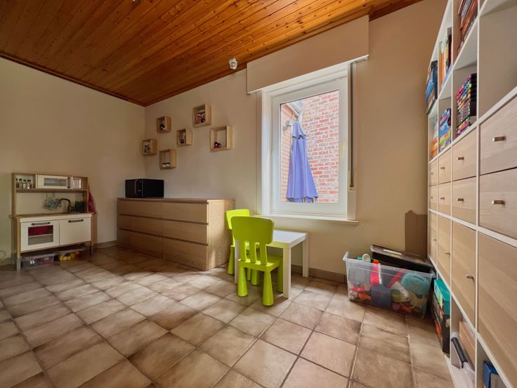 We treden de woning binnen via de inkom met gastentoilet. De inkomhal leidt u naar de lichtrijke woonkamer, voorzien van een gezellige zit- én eethoek. Aansluitend bevindt zich de open ingerichte keuken, voorzien van een frigo, oven, vaatwas, gootsteen, dampkap en ingemaakte kasten. Tot slot beschikt het gelijkvloers over een badkamer (ligbad + lavabomeubel), een polyvalente ruimte (speelhoek/bueel/...) en een ruime wasruimte/berging.