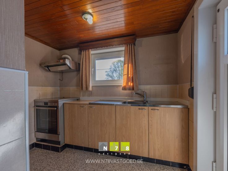 - Keuken ((4,00m x 4,00m) + (1,00m x 2,80m) = 18,80m²): onder- en bovenkasten, dampkap, elektrisch vuur, laminaatvloer.