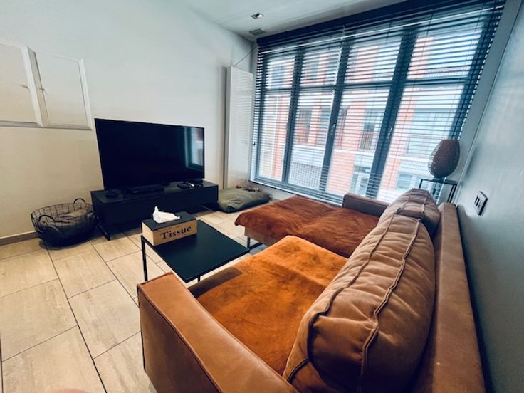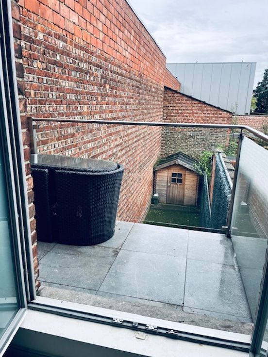 Op het eerste verdiep vind je de open leefkamer met nieuw geïnstalleerde keuken en zuidgericht terras.