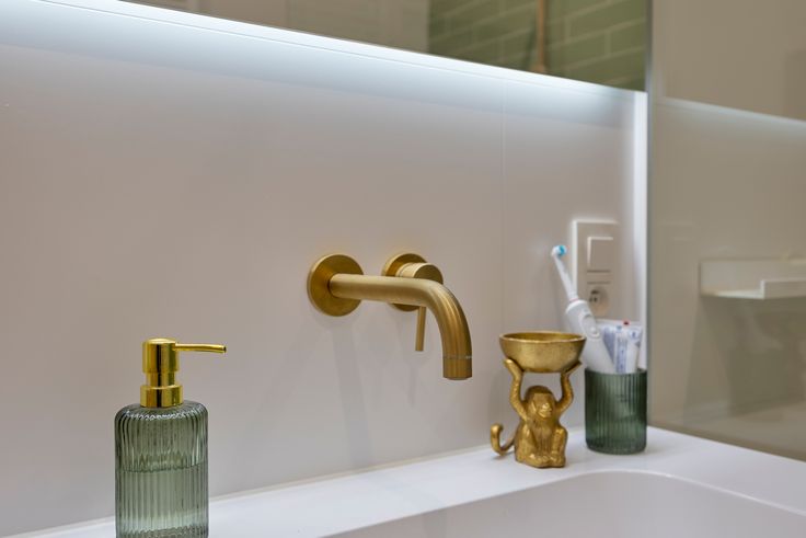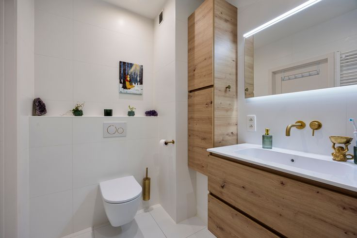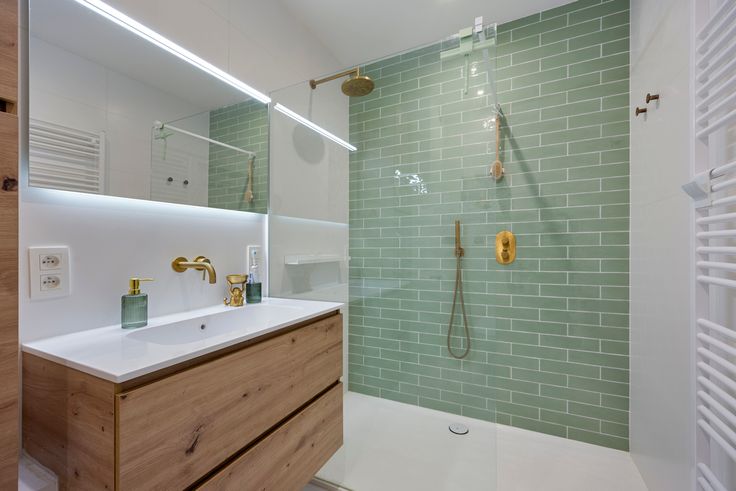 De moderne badkamer met inloopdouche, brede lavabo, goud geborstelde inbouwkranen en warme houtaccenten is een echte eyecatcher.