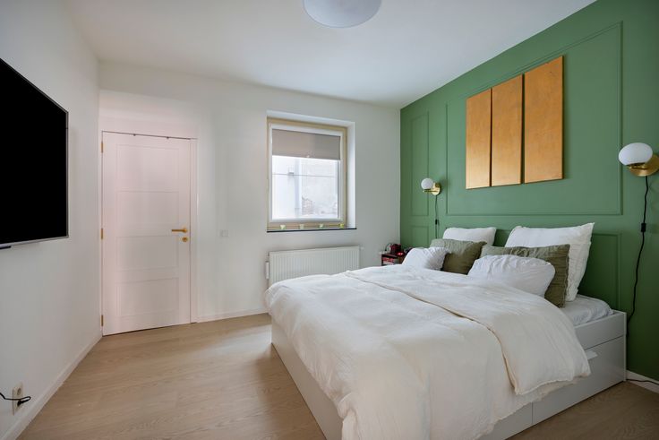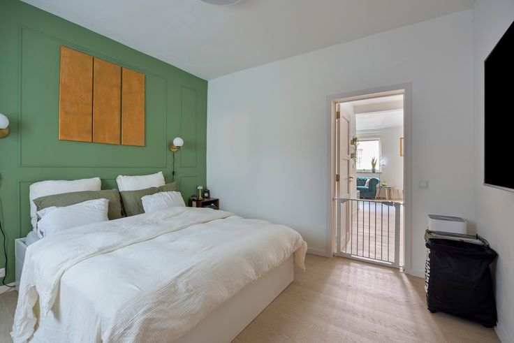 De slaapkamer straalt rust uit dankzij de groene accentmuur.