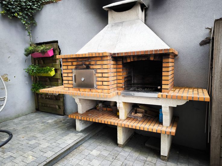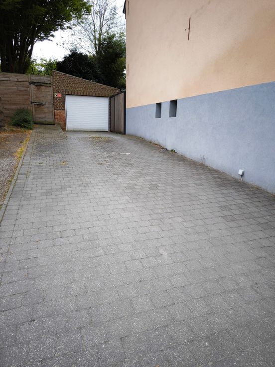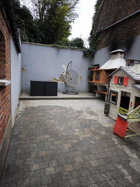 En extérieur une grande terrasse avec barbecue et four au bois et une grande garage avec porte automatique et rangement. Une allée tout au long de la maison qui peut garer 3 voitures.