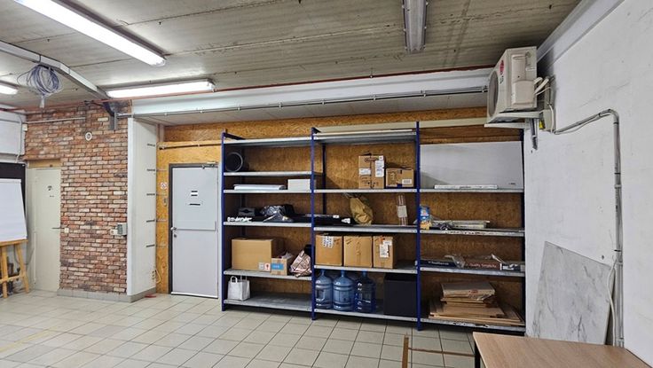 - De huidige magazijnruimte, die perfect kan geïntegreerd worden bij de huidige kantoorruimte, is van dezelfde vloer voorzien als de kantoorruimte en kan dus ingericht worden als één grote kantoor-/winkel-/handelsruimte en heeft een apart toilet.
