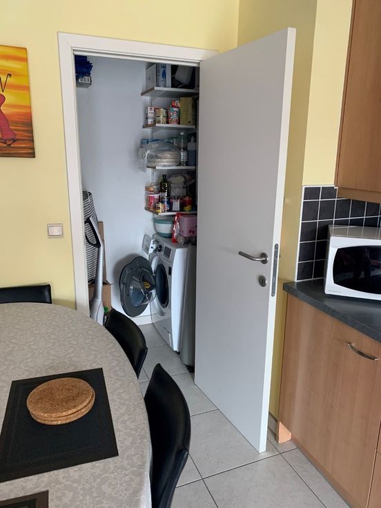 Bestaat uit inkom, woonkamer met open keuken + afgesloten bergruimte (met combi wasmachine-droogkast), 1 slaapkamer, badkamer met douche en separaat toilet.