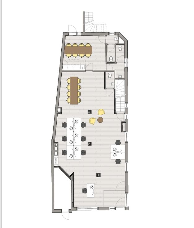 Het pand omvat 157 m² kantoorruimte verdeeld over het gelijkvloers en nog eens 100 m² kelderverdieping.