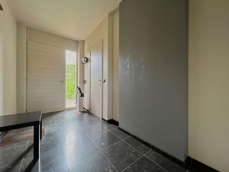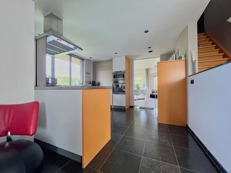 Via de inkomhal met gastentoilet en vestiaire, bereiken we de ruime, lichtrijke woonkamer, ingedeeld in een gezellige zithoek met design houthaard en een eethoek. Aangrenzend bevindt zich de ingerichte keuken, voorzien van een gaskookplaat, dampkap, oven, microgolf, koelkast + ingemaakte kasten + aparte eethoek. Tot slot beschikt het gelijkvloers over een bureelruimte (mét ingemaakte kasten), een praktische kelderberging, een aparte wasplaats + inpandige garage.