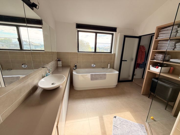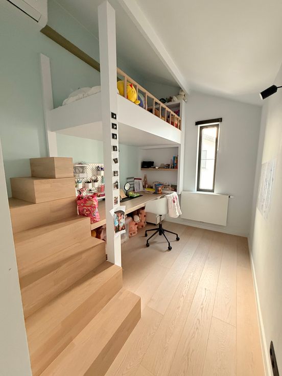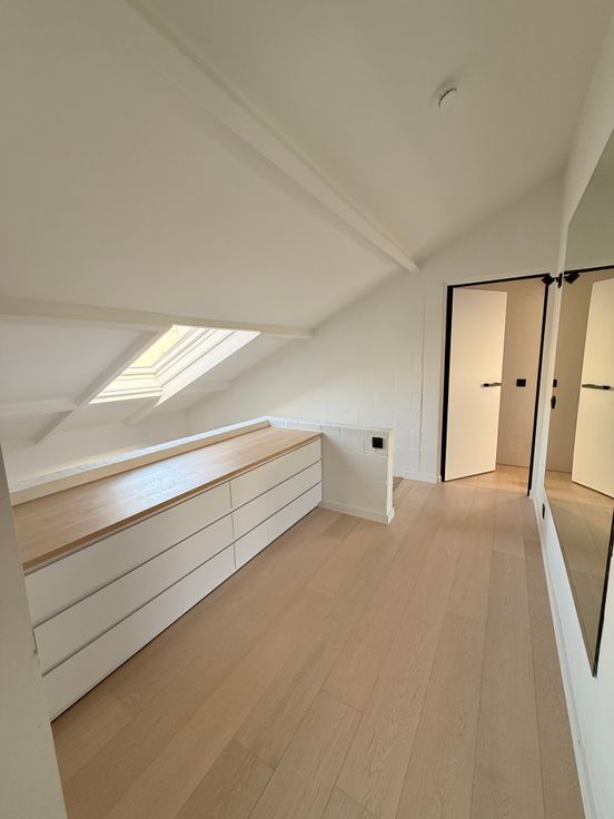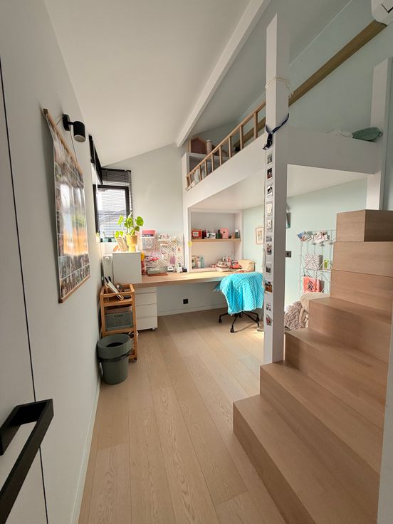 Op de verdieping bevinden zich drie slaapkamers: een master met dressing en twee volledig ingerichte kinderkamers met ingebouwde kasten, bureau en bed. Een extra dressingruimte in de nachthal biedt bijkomende opbergruimte. De ruime badkamer beschikt over een dubbele inloopdouche en een ligbad.