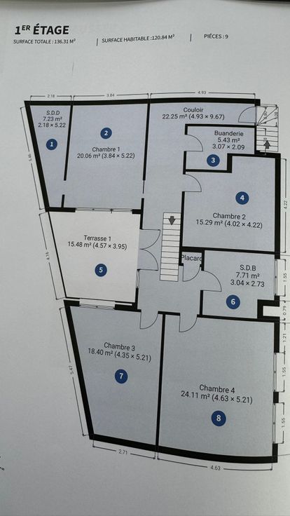 Entrée via parking intérieur (2 places de parking) au rez-de-chaussée. Au 1er, Hall d'entrée avec buanderie, 4 chambres et 2 salles de bains. Une belle petite terrasse de 15 m2 se trouve entre 2 des chambres.