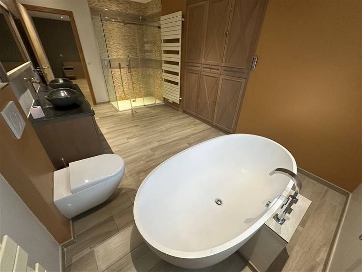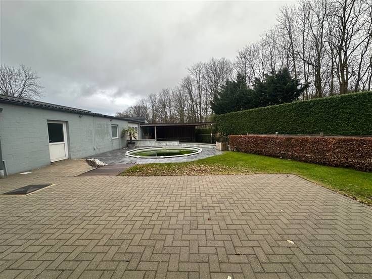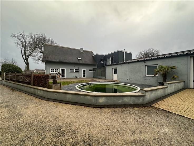 Villa + magazijnen 4-gevel villa met een oppervlakte van 310m2 in overeenstemming met de EPB Grote woon- en eetkamer, ingerichte keuken, bijkeuken, toilet en groot kantoor op de begane grond. Eerste verdieping: 4 slaapkamers en 2 badkamers, ouderlijke ruimte met kleedkamer + badkamer en slaapkamer. Gevolgd door 3 slaapkamers en een badkamer. Het complex bestaat uit grote loodsen en kantoren, met een magazijnoppervlakte van 500 m2 Het huis voldoet aan de elektrische normen, PEB C, olie verwarmingssysteem, alarmsysteem en bewakingscamera. zolder en kelder. De grondoppervlakte is 17 are, groot terras van 50M2, overdekte carport voor 2 auto's, buitenveranda + zwembad met warmtepomp en zonnepaneel voor water op het dak van de hangars.