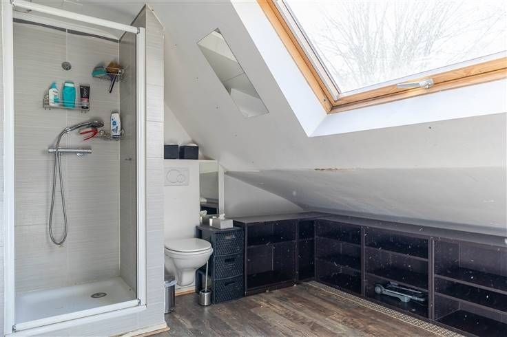Op de eerste verdieping bevinden zich drie comfortabele slaapkamers en een badkamer, evenals toegang tot de volledig ingerichte zolderverdieping, bestaande uit een suite met slaapkamer, doucheruimte en dressing.