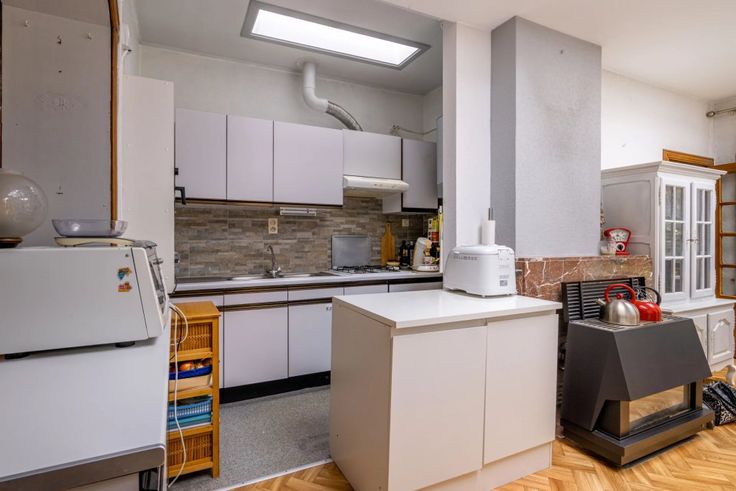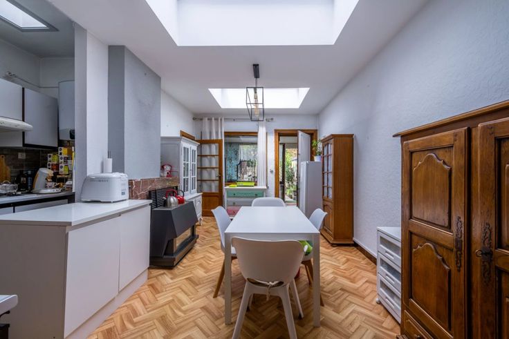 Au rdc: hall d’entrée, un grand bureau ou chambre de 13m², lumineux salon, cuisine équipée ouverte sur la salle à manger, salle de bains et espace atelier.