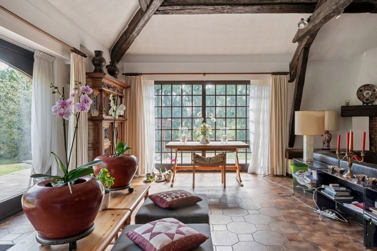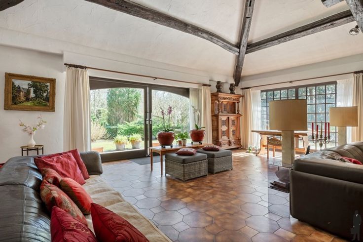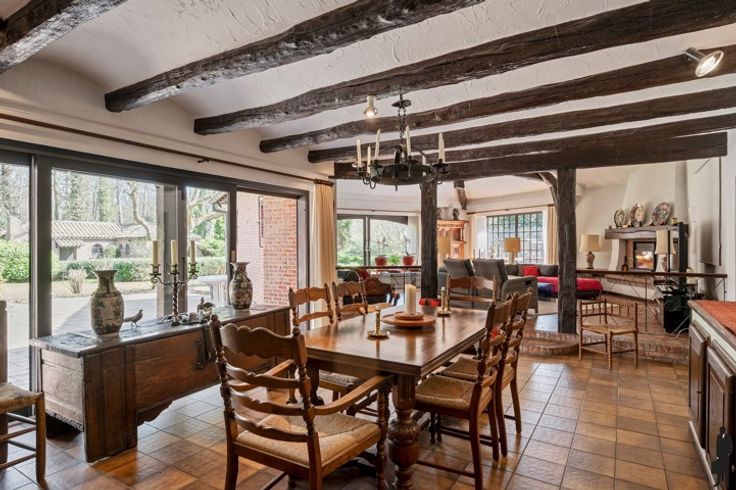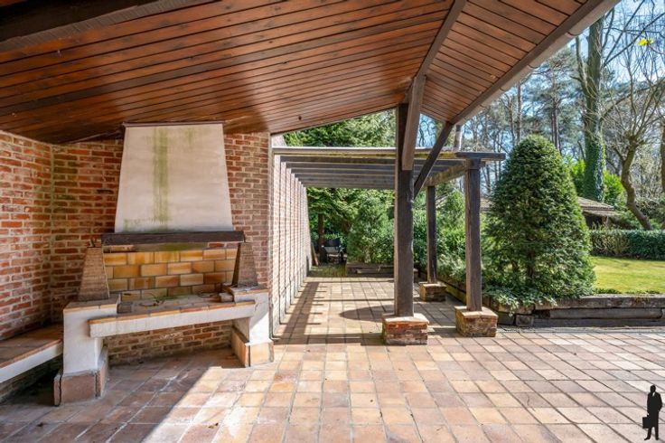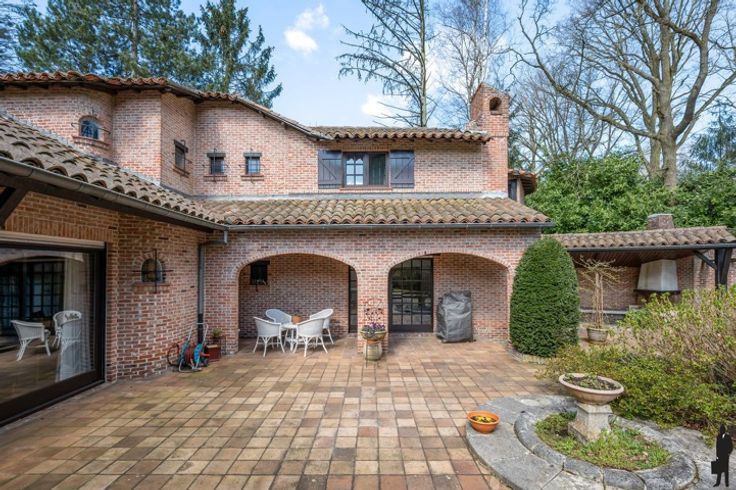 Unieke Spaanse villa op toplocatie in Schoten – boordevol charme, karakter en potentieel! Gelegen op een prachtig perceel van 40m breed in een doodlopende, residentiële straat: rust, privacy en ruimte gegarandeerd. Indeling gelijkvloers: Inkomhal met vestiaire, gastentoilet en authentieke handenwasser. Bureau ideaal als thuiswerkplek. Lichtrijke woonkamer met open haard en zicht op de tuin, eetkamer met schuifraam naar terras, gesloten keuken met Gaggenau-toestellen, bijkeuken/wasplaats, inpandige garage en wijnkelder. Hoofdslaapkamer met haard, dressing en luxueuze badkamer. Verdieping: Vier slaapkamers, waarvan één met dressing en toegang tot een tweede badkamer met ligbad, douche en dubbele lavabo. Extra bergzolders en nachttoilet aanwezig. Tuin: Zuid-oost georiënteerde tuin met terrassen, volledige privacy, blijvend vrij zicht op bos (geen bebouwing mogelijk), tuinhuis/garage met haard en ingebouwde barbecue. Algemeen: Gasverwarming (vloerverwarming en radiatoren), manuele en elektrische rolluiken, alarminstallatie. Gebouwd door Vlassak Verhulst. Te renoveren (dak, ramen, technieken) maar unieke kans op toplocatie vlak bij centrum Schoten.