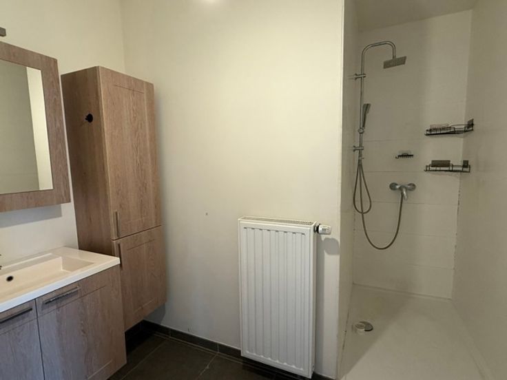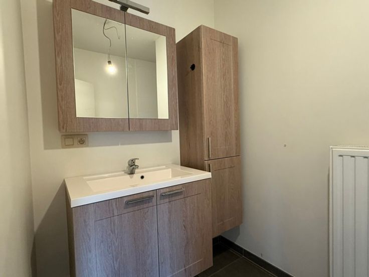 INDELING: Inkomhal, gastentoilet, lichtrijke leefruimte, ingerichte open keuken (met spoeltafel, keramische kookplaat, dampkap, oven, koelkast met diepvriesvak), badkamer (met douche en lavabo), twee slaapkamers en een berging/wasplaats.