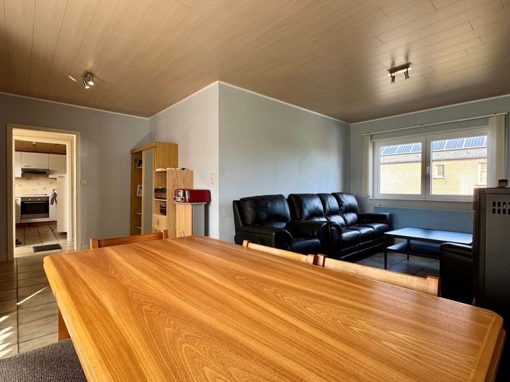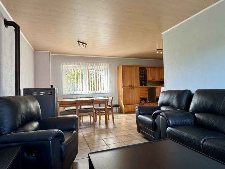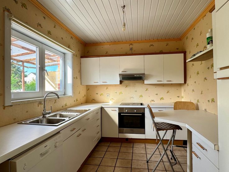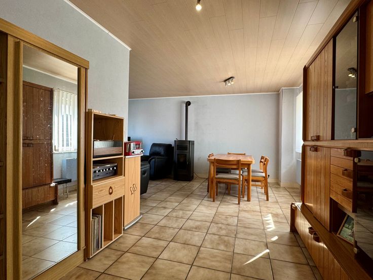Au rez-de-chaussée : hall d’entrée (3m²), vaste séjour lumineux de 30m² avec poêle à pellets, cuisine semi-équipée indépendante de 9m² (four, taques vitrocéramiques, hotte, frigo, congélateur, double éviers), hall de nuit de 5m², 2 chambres (11m² et 7m²), salle de bains de 6m² (baignoire, lavabo et WC), buanderie de 4m².