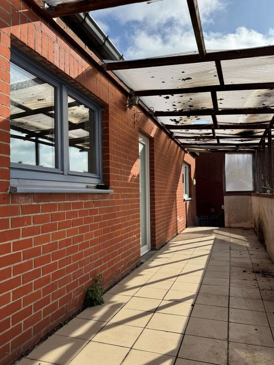 A l’extérieur : jardin clôturé et bien exposé (SUD), passage latéral via une servitude commune, grande terrasse carrelée de 20m² avec vue sur jardin, accès maison sur le coté.