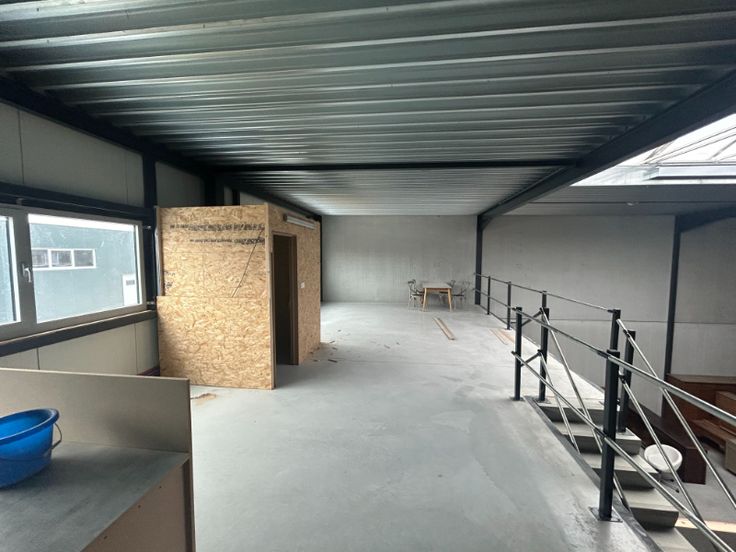De unit is degelijk opgebouwd in staalstructuur met betonpanelen en heeft een voorgevel met betonnen plint tot 2 meter hoog, afgewerkt met geïsoleerde sandwichpanelen.