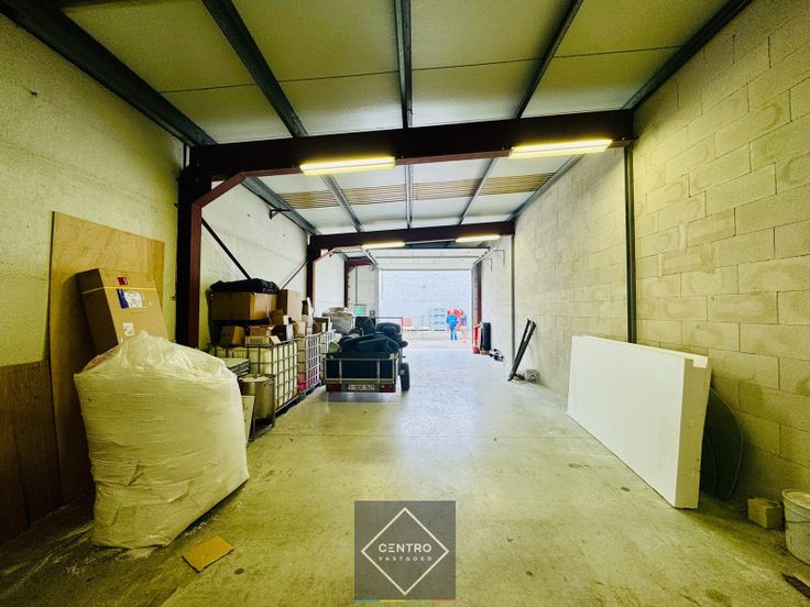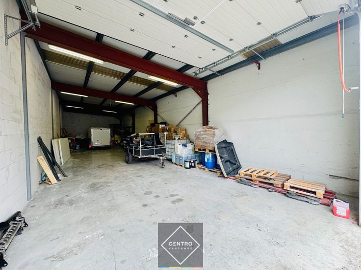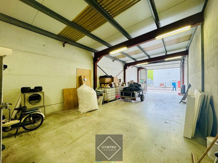 Magazijn (6m x 20m): Metalen constructie, gepolierde betonvloer, vrije hoogte: 4m, 1 elektrische sectionaalpoort (h: 4,0m), TL-verlichting.