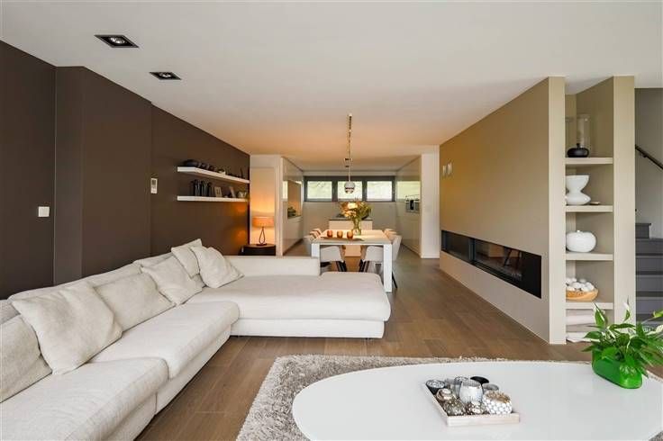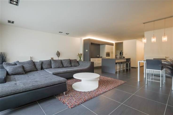 Het duplex appartement (132m²) betreden we door middel van de trap die ons meteen toegang geeft tot de woonkamer (46m²) met volledig ingerichte keuken open keuken en afzonderlijk toilet.