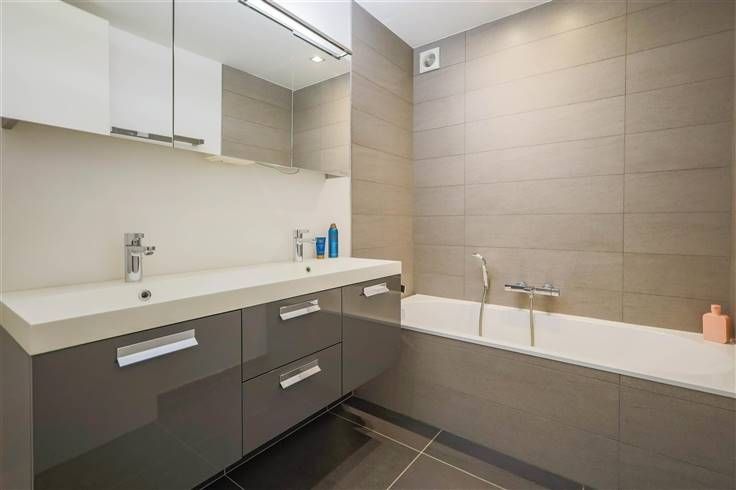 Via de hal lopen we door naar de badkamer met ligbad en afzonderlijk toilet, 2 slaapkamers van 11m² en 9m² waarvan 1 voorzien van volledig ingemaakte kasten.